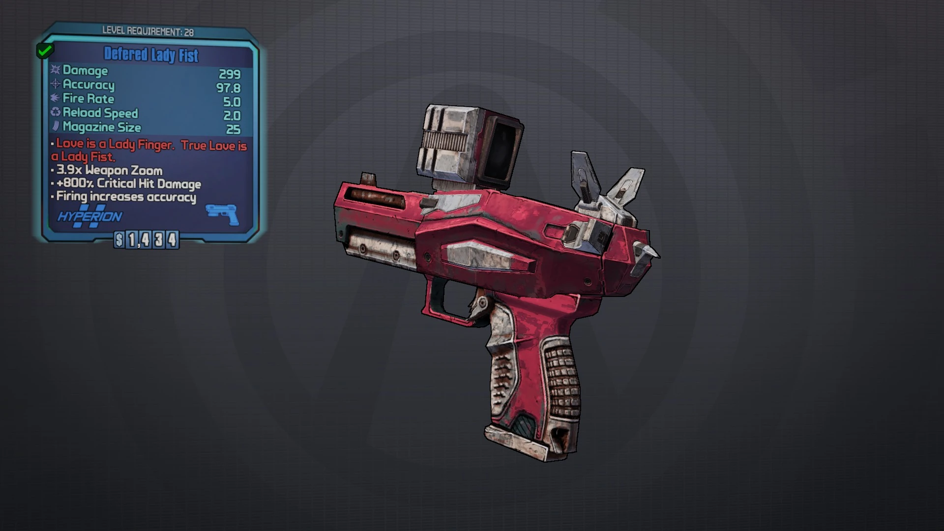 Sustained fire increases Hyperion weapons accuracy. Damage is Win-Win but a lot of people prefer Dynamic as too it is good. Reward for mailing blueprints to Una Baha in the quest Uncle Teddy Amplified Lady Fist is a rare pistol in Borderlands 2 It is the Una reward for the mission Uncle Teddy Note. Sustained fire increases Hyperion weapons accuracy. Hi just wondering which lady fist I should get for a gunzerker and a siren prefix. You can get 2 Lady Fists per run if you use a split screen mule. Love is a Lady Finger.