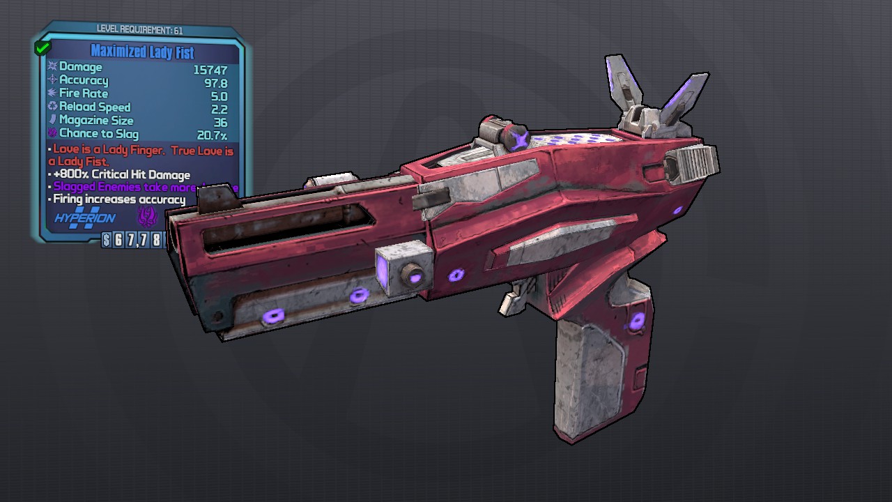 True Love is a Lady Fist is a red text modifier on weapons in Borderlands 2. Lvl Prefix Dmg Acc RoF Reload Mag Element Chance Notes Image 28 Core. And this pistol feels so good when you fire it. Which loot do you think is the best. Extremely High 800 critical Hit Bonus. The Horrible Hunger of the Ravenous Wattle Gobbler is a DLC for Borderlands 2 featuring a Thanksgiving theme. True Love is a Lady Fist is a red text modifier on weapons in Borderlands 2. Im going for slag obviously but what are the best parts to look out for on the Lady Fist. You just need to make a new character on the 2nd player side for each run.